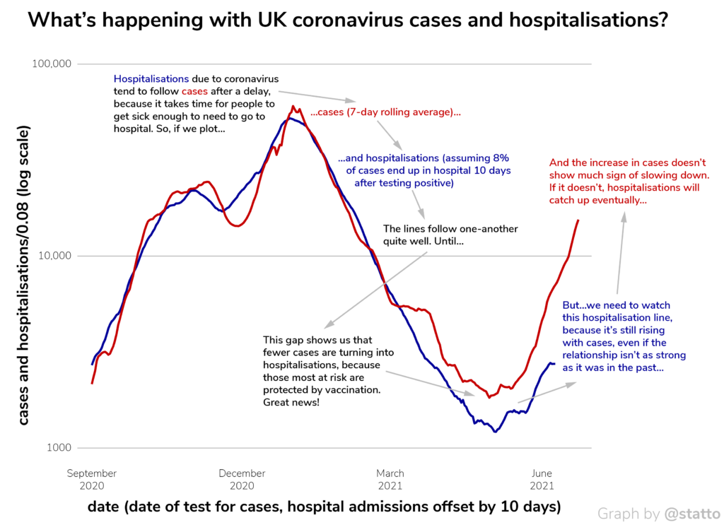 The other thing that’s a bit nerve-wracking is that even though we think the number of cases being hospitalised with covid has dropped from 8% to 4% thanks to the vaccines—a halving, which is an amazing testament to the power of science—that only actually buys the NHS about two weeks. That’s because cases and hospitalisations are growing exponentially at the moment, with roughly a two-week doubling time.